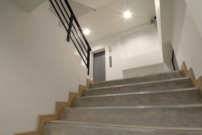 Newly built building and room that has little to no furnishment with raw concrete both on the outside and inside, with simple wooden doors and white painted wood panel walls. Just for living with...