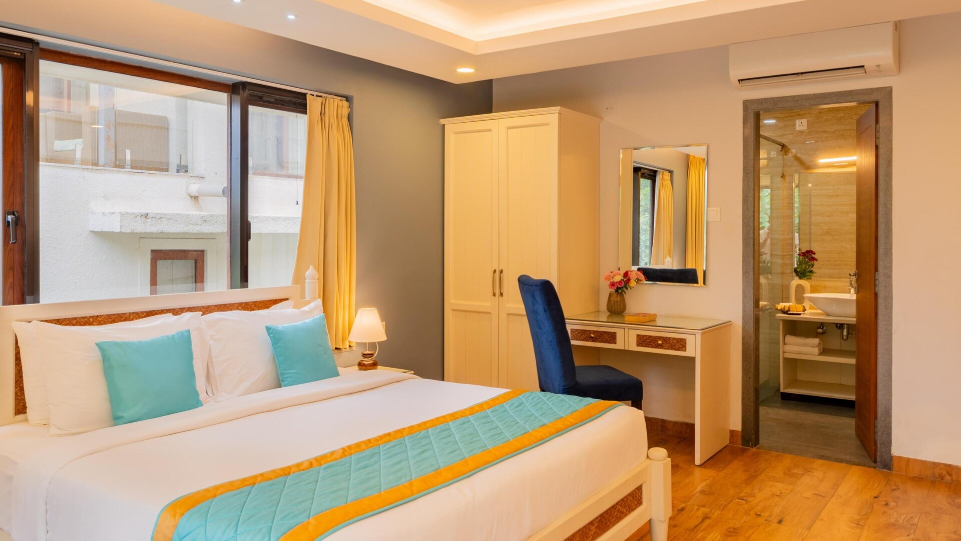 Bedroom-1 One King-Sized Bed Ensuite Bathroom | AC Fan Wardrobe Space Work/Study Desk Space Spacious Attached Balcony With Seating Located On The Second Floor.