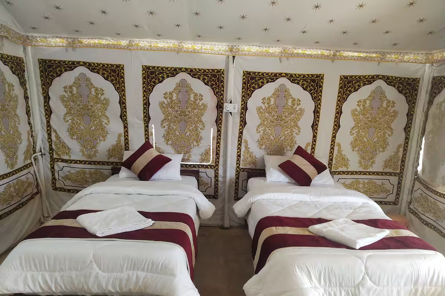 Guests Can Choose From Beautifully Furnished Luxury Tents Featuring Comfortable Bedding, Attached Bathrooms, Air Cooling, And Free Wi-Fi. Even In The Heart Of The Desert, The Camp Provides Modern Comforts Like On-Site Dining, 24-Hour Service, And Secure Parking.
