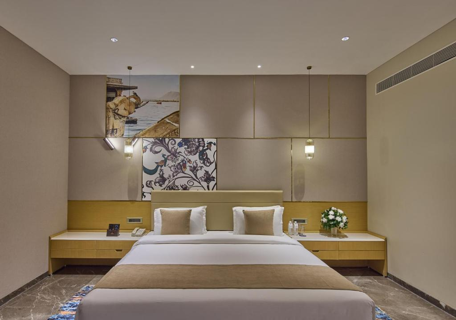 Guests can unwind by the rooftop swimming pool, take in panoramic views over the city, or dine under the stars at Aasman Rooftop, enjoy signature cocktails at the Unwind Bar, or savour global and Rajasthani delicacies at Flavours. The hotel also offers an 8,000+ sq ft of banquet space — ideal for weddings, conferences, and special events — and a well-equipped fitness centre, concierge, travel desk, and ample parking for up to 100 cars.