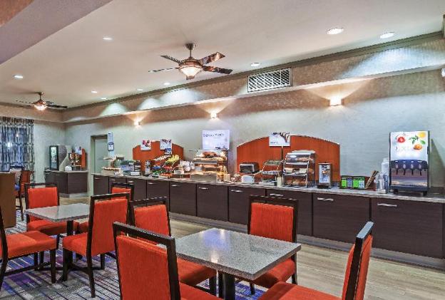 Nice hotel. Chili's is next door and Pappadeaux Seafood is a short drive away. Walmart is less than 3 miles away. Free parking and comp breakfast. Staff was kind, plenty of room lighting and plugs...