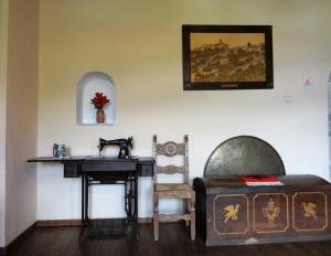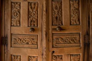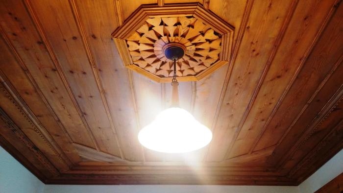 Our room has a beautiful carved ceiling and a double bed, which was OK. It also boasted a grand fireplace! We had a very small window, so no view, but there are views aplenty when you step outside...