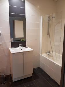 Chambre rénovée et propre. Salle de bain vaste et propre. Accueil très bien. Hôtel très simple (2 étoiles) mais tout à fait correct. On était dans une chambre familliale au 3è étage. On n'a pas testé...
