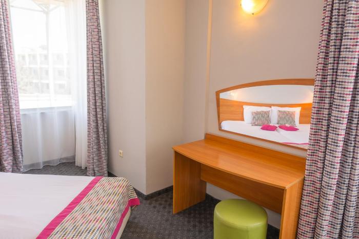 This 4-star hotel lies about 200 yards from a sandy beach, in a lively area right in Sunny Beach. From here, it is very easy for beach vacationers to embark on an exploratory tour and get to know the area a bit better. There are bars, restaurants and shops in the immediate vicinity, and the nearest nightclub is just 100 yards away.