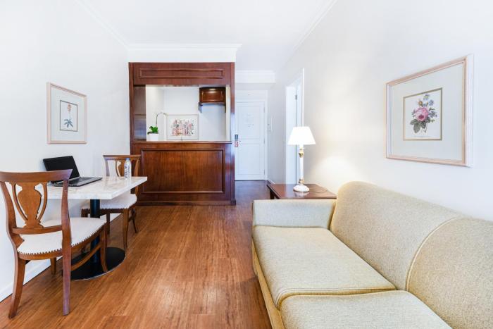 The rooms have a living area, a kitchen and a bathroom. Air conditioning ensures comfortable temperatures. A balcony is among the standard features of some rooms. All rooms are carpeted and have a double bed, a king-size bed or a sofa bed. A safe and a minibar are also available. The kitchenette comes with a microwave and a tea/coffee station. An ironing set is provided for guests' convenience. A direct dial telephone, a television with satellite/cable channels, a radio, a stereo system, a DVD player and WiFi are provided as well. Bathrooms are equipped with a shower and a bathtub, as well as a hairdryer. Guests can also reserve wheelchair-friendly rooms with wheelchair-accessible bathrooms. The hotel has family rooms and non-smoking rooms.