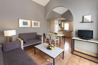 The rooms have a living area, a kitchen and a bathroom, as well as air conditioning and central heating. Some rooms include a balcony. The rooms have a double bed and a sofa bed. Separate bedrooms can be reserved. Children's beds and extra beds can be requested for younger guests. A safe provides secure storage for guests' personal property. There is a fully-equipped kitchenette with a refrigerator, cooktop, microwave and tea/coffee station. A direct dial telephone, a TV and WiFi (no extra charge) ensure optimal comfort. A hairdryer and a vanity mirror are available in the bathrooms, which are equipped with a shower and a whirlpool bath. The hotel has 20 non-smoking rooms.
