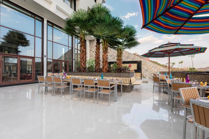 The dining area includes a restaurant and a café.